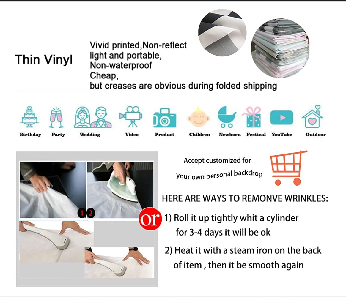 • Warm Tips:1.Only backdrop included,item will be sent by folded.2.Iron the backside with low temperature can remove the creases.