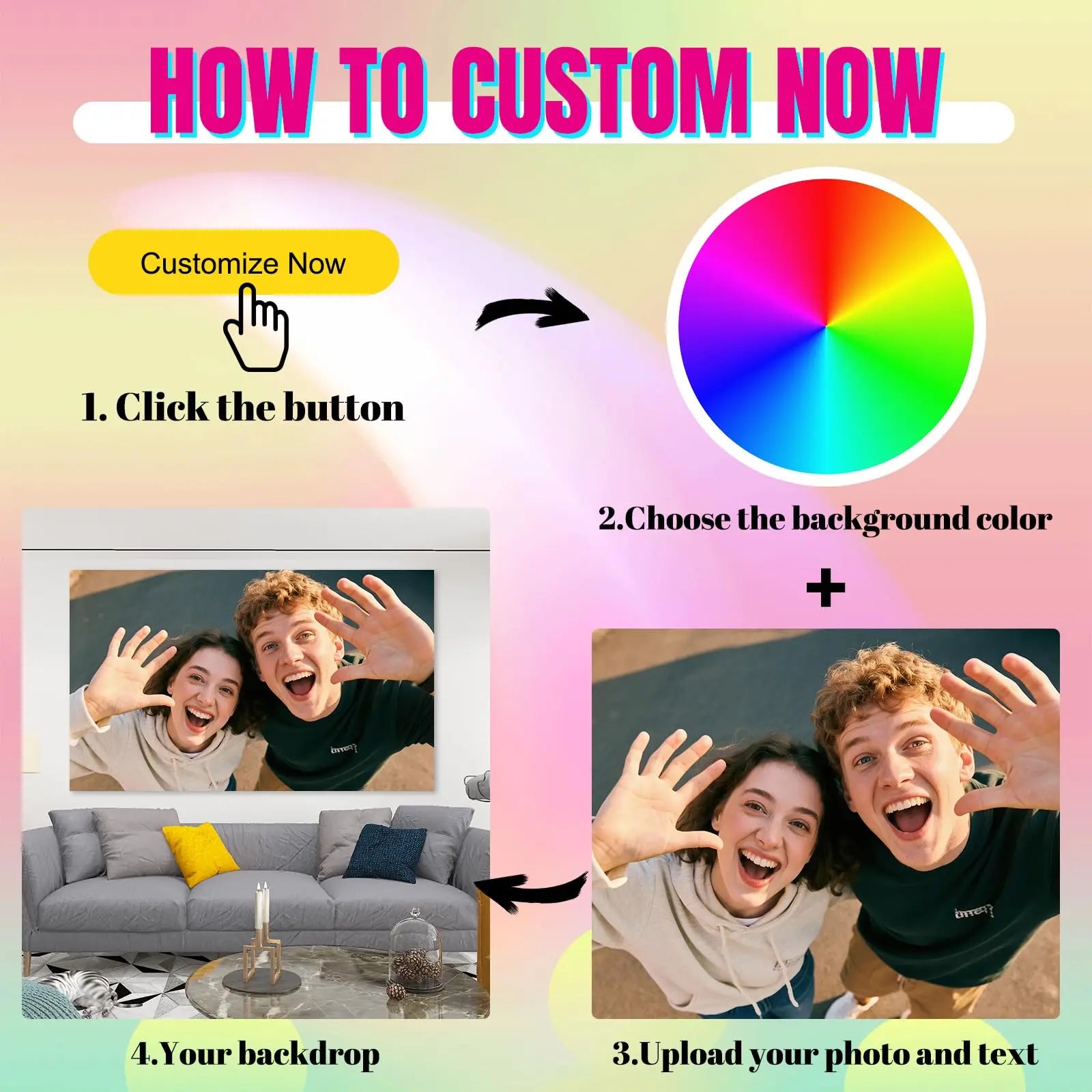 • Personalized Backdrop: Choose the size to create a one-of-a-kind custom picture backdrop for birthday, wedding, anniversary, party, baby shower or graduation. The higher the image resolution, the clearer the print effect. Click the "Customize Now" button to customized backdrop to improve your work efficiency.