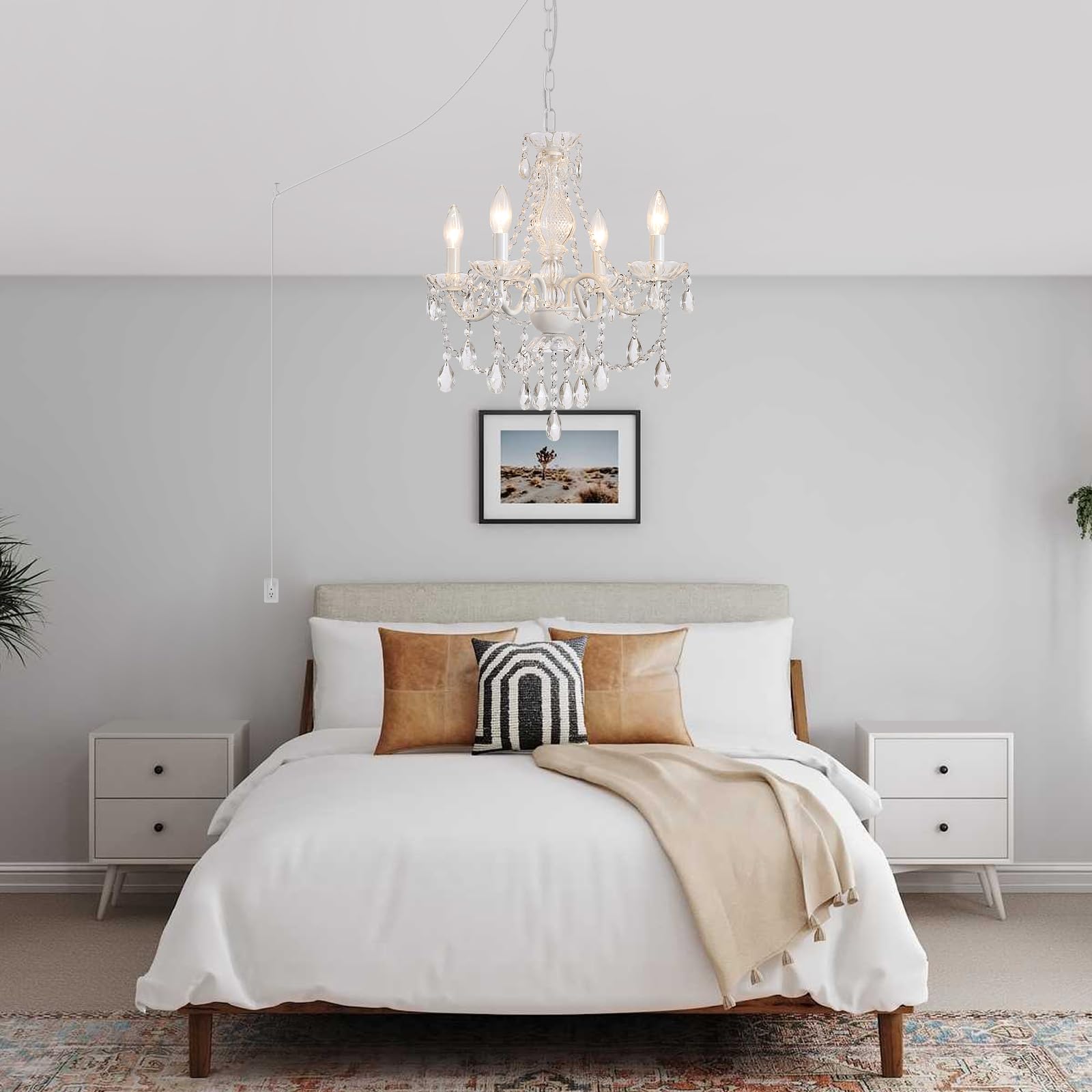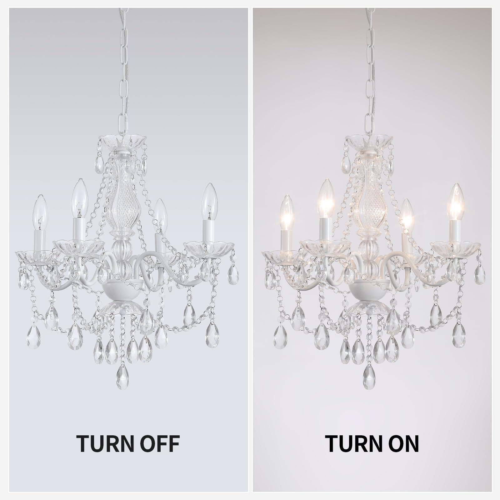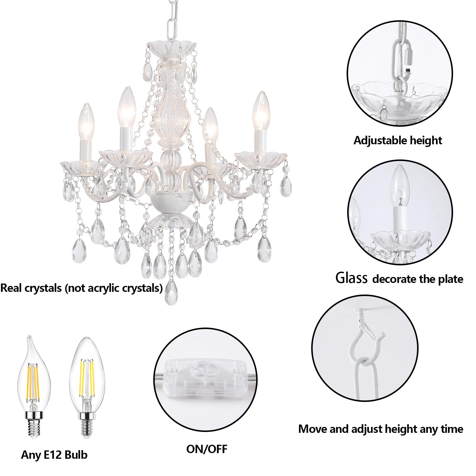 Plug in Crystal Ceramic White Chandelier, Glass Chandeliers,White crystal Hanging Pendant Light with Clear Cord and On/Off, 4 Light Crystal Chandelier for wedding, Kitchen, Dining,Foyer, Mini room Backdrop Bliss