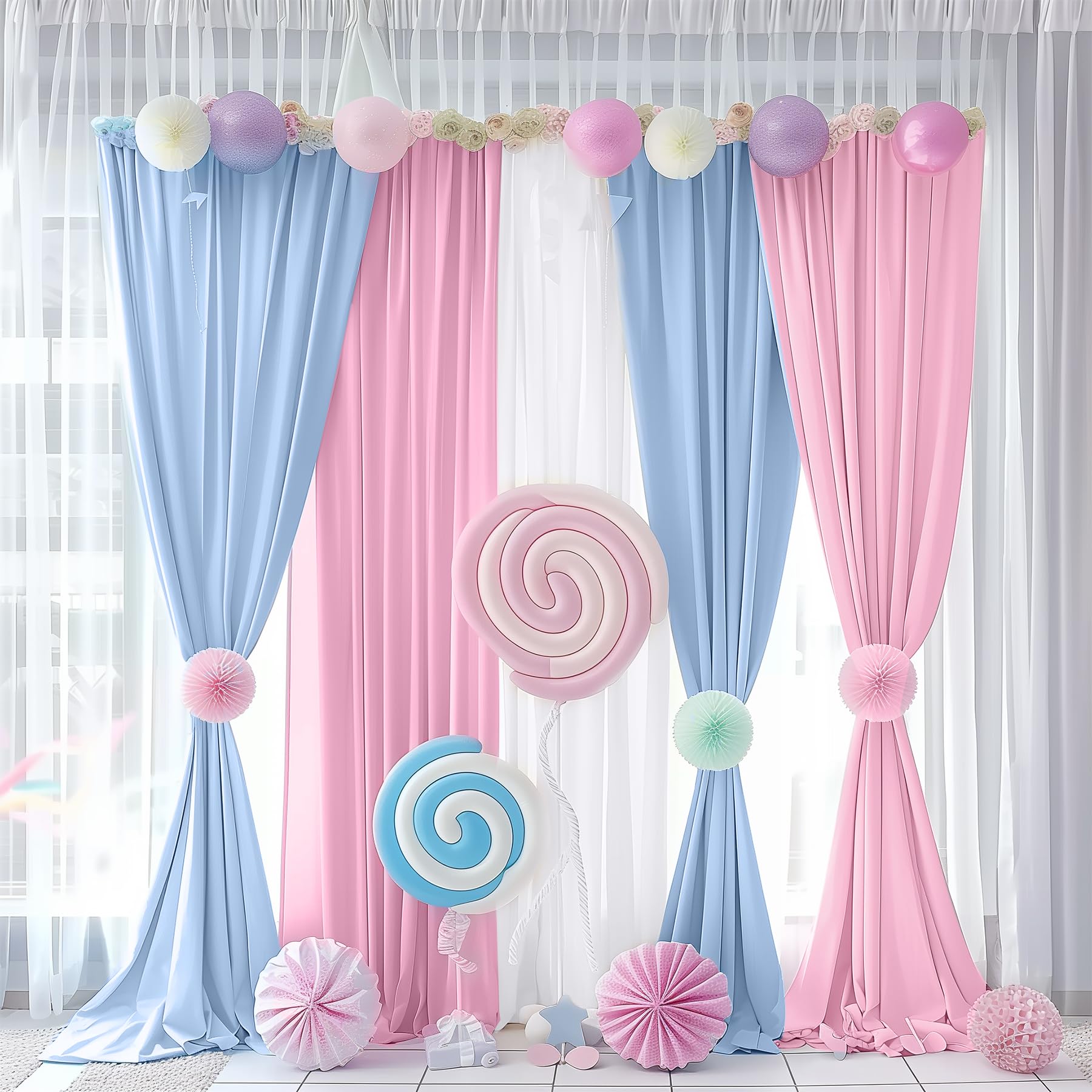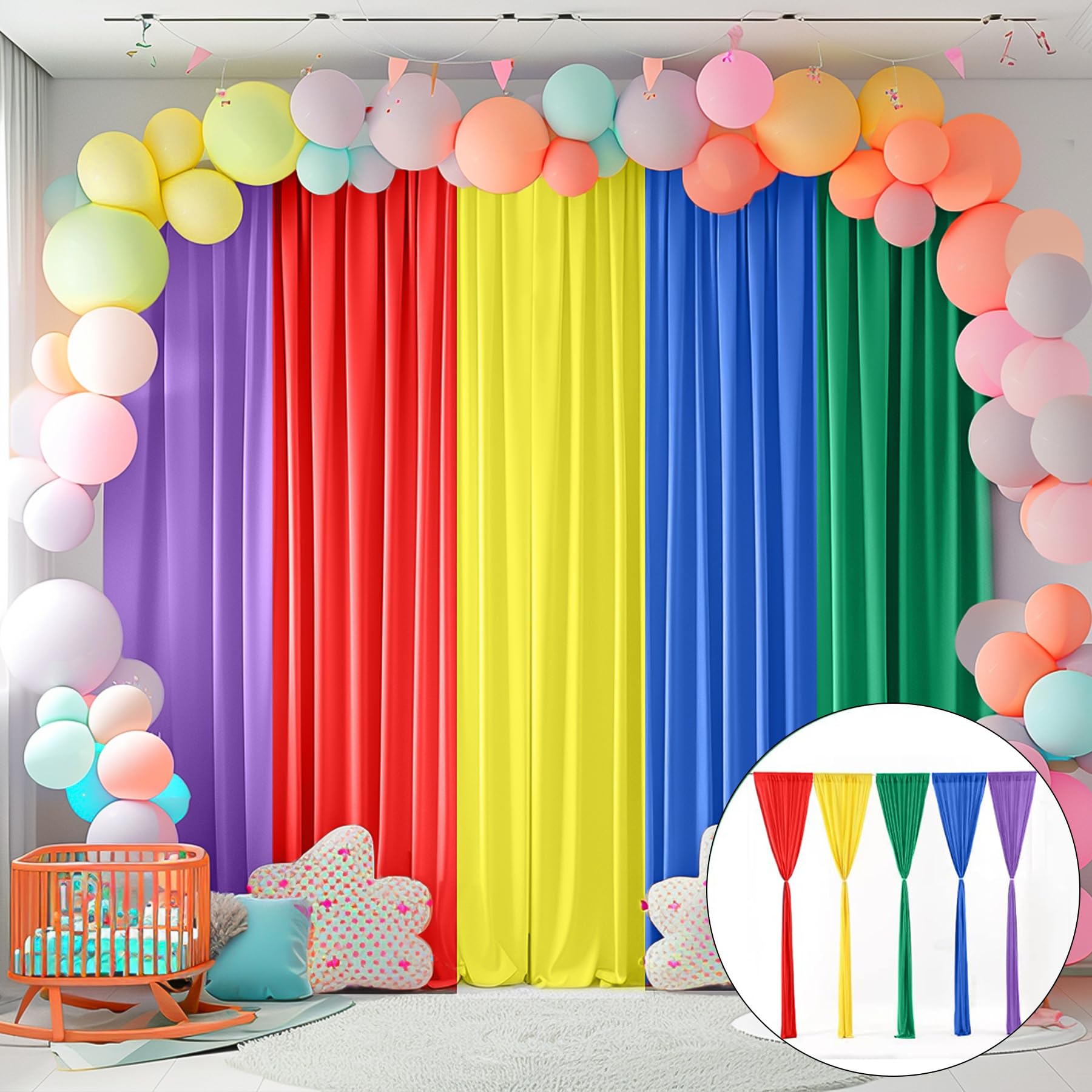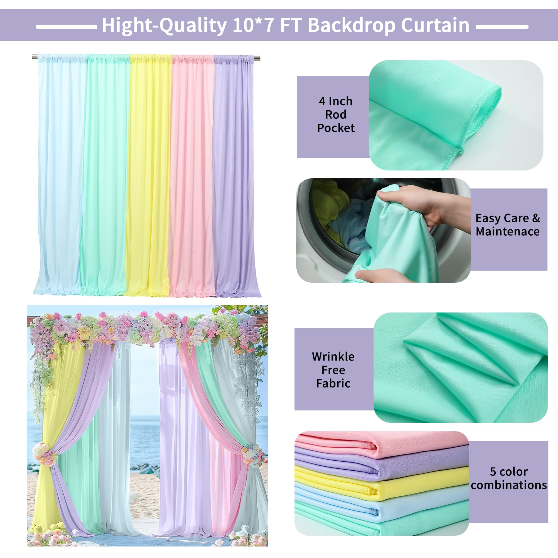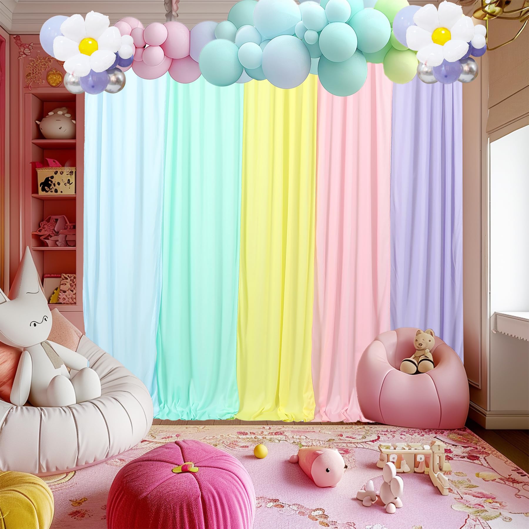 • Pastel Rainbow Backdrop: Includes 5 pieces of backdrop curtains, 1 piece blue, 1 piece green, 1 piece pink, 1 piece yellow, and 1 piece purple. Each piece is 2ft wide and 7ft long, for a total width of 10ft.